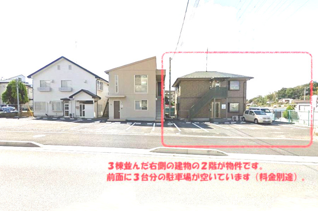 3棟並んだ右側の建物の2階が物件です。前面に3台分の駐車場が空いています(料金別途)。