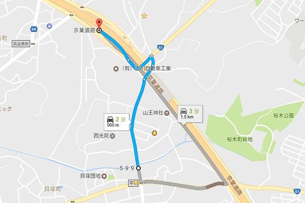 京葉道路貝塚IC(上り)まで車で2分です(900m)。